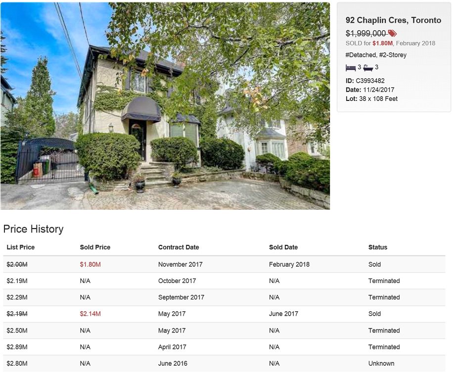 This house located in the “high demand” Chaplin Estates area of Toronto was bought for $2.14M back in June 2017 after several failed listings in the $2.5M+ range. Sold again in February 2018 for $1.8M for a $314k++ loss. Price discovery at its finest.